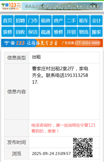 曹家庄村出租2室2厅,家电齐全。联系电话19131325817.
