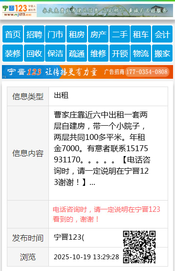 曹家庄靠近六中出租一套两层自建房,带一个小院子,两层共同100多平米。年租金7000。有意者联系15175931170。。。。。 【电话咨询时,请一定说明在宁晋123看到的,谢谢!】 |