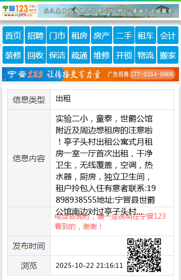 地址:宁晋县世爵公馆南边对过亭子头村 【电话咨询时,请一定说明在宁晋123看到的,谢谢!】 |
