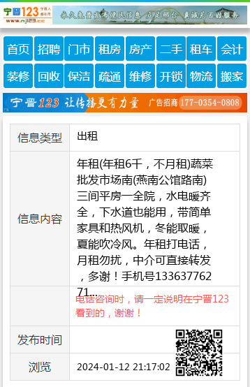 年租(年租6千,不月租)蔬菜批发市场南(燕南公馆路南)三间平房一全院,水电暖齐全,下水道也能用,带简单家具和热风机,冬能取暖,夏能吹冷风。年租打电话,月租勿扰,中介可直接转发,多谢!手机号13363776271 【电话咨询时,请一定说明在宁晋123看到的,谢谢!】 |