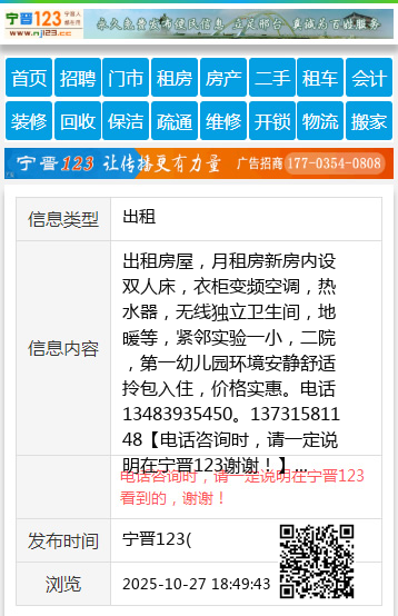 出租房屋,月租房新房内设双人床,衣柜变频空调,热水器,无线独立卫生间,地暖等,紧邻实验一小,二院,第一幼儿园环境安静舒适拎包入住,价格实惠。电话13483935450。13731581148 【电话咨询时,请一定说明在宁晋123看到的,谢谢!】 |