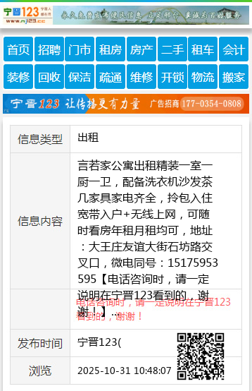 言若家公寓出租精装一室一厨一卫,配备洗衣机沙发茶几家具家电齐全,拎包入住宽带入户+无线上网,可随时看房年租月租均可,地址:大王庄友谊大街石坊路交叉口,微电同号:15175953595 【电话咨询时,请一定说明在宁晋123看到的,谢谢!】 |