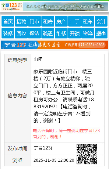 家乐园附近临街门市二楼三楼(2万)有独立楼梯,独立门口,方方正正,两层200平,楼上有卫生间,可做月租房可办公,请联系电话:18831920971 【电话咨询时,请一定说明在宁晋123看到的,谢谢!】 |
