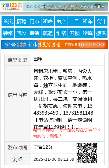 月租房出租,新房,内设大床,衣柜,变频空调,热水器,独立卫生间,地暖等,无线,紧邻实验一小,第一幼儿园,县二院,交通便利,价格实惠,欢迎来电,13483935450,13731581148 【电话咨询时,请一定说明在宁晋123看到的,谢谢!】 |