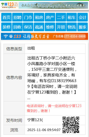 出租古丁桥小学二小附近六小凤凰路小学对面小区一楼,150平三室二厅交通便利,环境好,家具家电齐全,有地暖,有车位13831996639 【电话咨询时,请一定说明在宁晋123看到的,谢谢!】 |