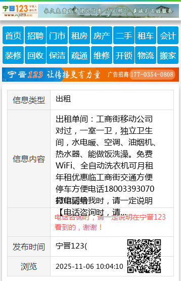 出租单间:工商街移动公司对过,一室一卫,独立卫生间,水电暖、空调、油烟机、热水器、能做饭洗澡。免费WiFi、全自动洗衣机可月租年租优惠临工商街交通方便停车方便电话18003393070微信同号