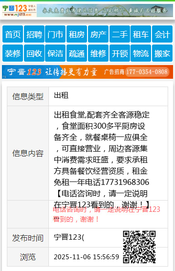 出租食堂,配套齐全客源稳定,食堂面积300多平厨房设备齐全,就餐桌椅一应俱全,可直接营业,周边客源集中消费需求旺盛,要求承租方具备餐饮经营资质,租金免租一年电话17731968306 【电话咨询时,请一定说明在宁晋123看到的,谢谢!】 |
