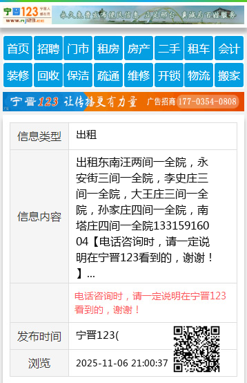 出租东南汪两间一全院,永安街三间一全院,李史庄三间一全院,大王庄三间一全院,孙家庄四间一全院,南塔庄四间一全院13315916004 【电话咨询时,请一定说明在宁晋123看到的,谢谢!】 |