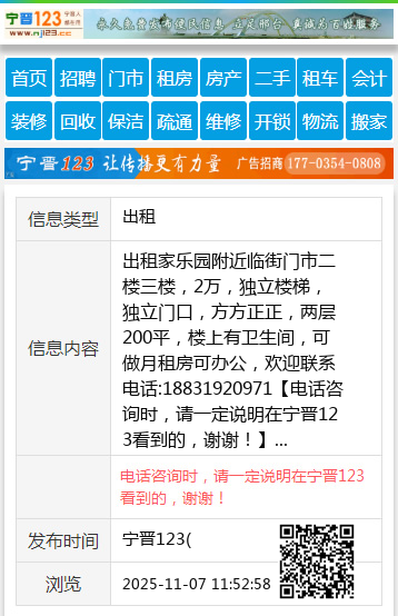 出租家乐园附近临街门市二楼三楼,2万,独立楼梯,独立门口,方方正正,两层200平,楼上有卫生间,可做月租房可办公,欢迎联系电话:18831920971 【电话咨询时,请一定说明在宁晋123看到的,谢谢!】 |