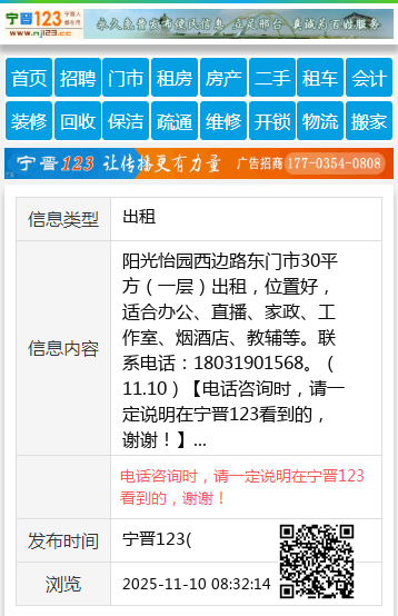 阳光怡园西边路东门市30平方(一层)出租,位置好,适合办公、直播、家政、工作室、烟酒店、教辅等。联系电话:18031901568。(11.10) 【电话咨询时,请一定说明在宁晋123看到的,谢谢!】 |