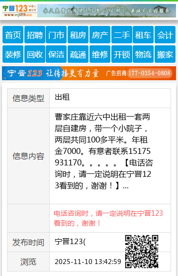 曹家庄靠近六中出租一套两层自建房,带一个小院子,两层共同100多平米。年租金7000。有意者联系15175931170。。。。。 【电话咨询时,请一定说明在宁晋123看到的,谢谢!】 |