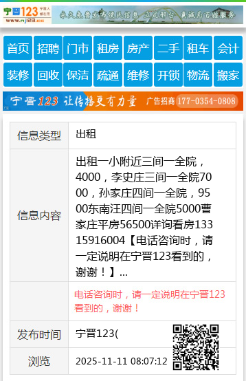 出租一小附近三间一全院,4000,李史庄三间一全院7000,孙家庄四间一全院,9500东南汪四间一全院5000曹家庄平房56500详询看房13315916004 【电话咨询时,请一定说明在宁晋123看到的,谢谢!】 |
