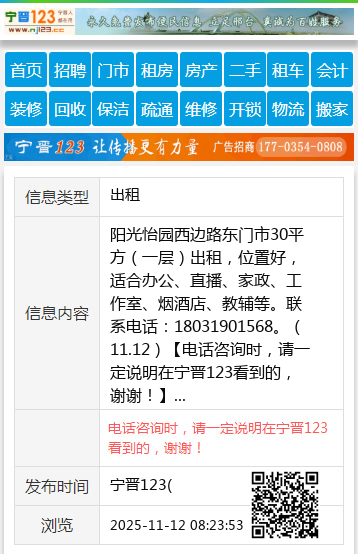 阳光怡园西边路东门市30平方(一层)出租,位置好,适合办公、直播、家政、工作室、烟酒店、教辅等。联系电话:18031901568。(11.12) 【电话咨询时,请一定说明在宁晋123看到的,谢谢!】 |