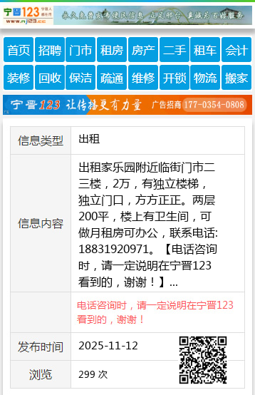 出租家乐园附近临街门市二三楼,2万,有独立楼梯,独立门口,方方正正。两层200平,楼上有卫生间,可做月租房可办公,联系电话:18831920971。 【电话咨询时,请一定说明在宁晋123看到的,谢谢!】 |