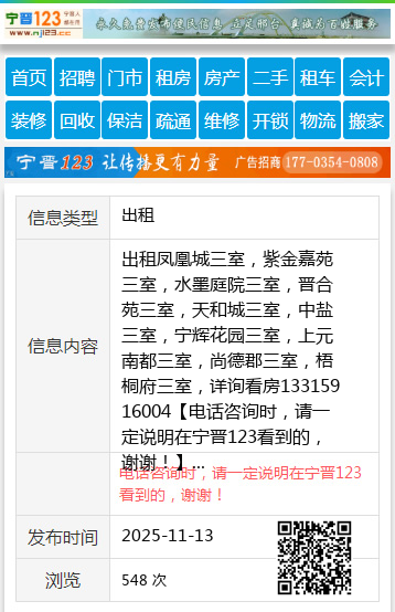 出租凤凰城三室,紫金嘉苑三室,水墨庭院三室,晋合苑三室,天和城三室,中盐三室,宁辉花园三室,上元南都三室,尚德郡三室,梧桐府三室,详询看房13315916004 【电话咨询时,请一定说明在宁晋123看到的,谢谢!】 |