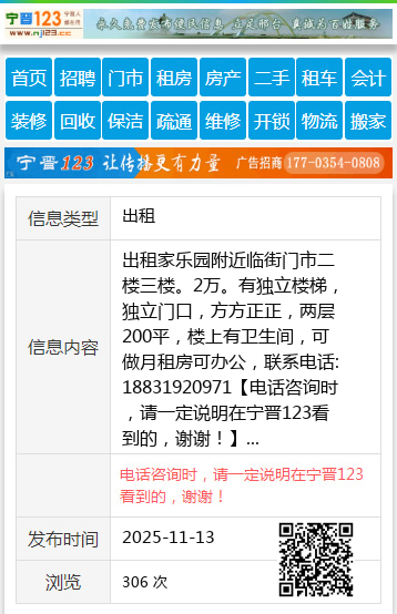 出租家乐园附近临街门市二楼三楼。2万。有独立楼梯,独立门口,方方正正,两层200平,楼上有卫生间,可做月租房可办公,联系电话:18831920971 【电话咨询时,请一定说明在宁晋123看到的,谢谢!】 |