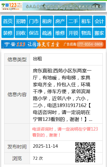 房东直租:西苑小区东两室一厅,有地暖,有电梯,家具家电齐全,拎包入住,环境干净,停车方便,紧邻滨湖路小学,近邻八中,六小,二小,电话18931917162 【电话咨询时,请一定说明在宁晋123看到的,谢谢!】 |