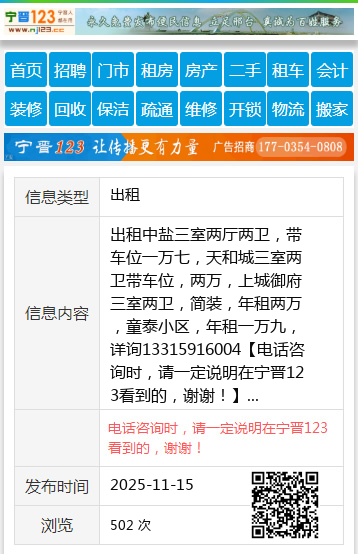 出租中盐三室两厅两卫,带车位一万七,天和城三室两卫带车位,两万,上城御府三室两卫,简装,年租两万,童泰小区,年租一万九,详询13315916004 【电话咨询时,请一定说明在宁晋123看到的,谢谢!】 |