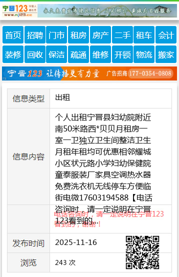 个人出租宁晋县妇幼院附近南50米路西*贝贝月租房一室一卫独立卫生间整洁卫生月租年租均可优惠相邻耀城小区状元路小学妇幼保健院童泰服装厂家具空调热水器免费洗衣机无线停车方便临街电微17603194588 【电话咨询时,请一定说明在宁晋123看到的,谢谢!】 |