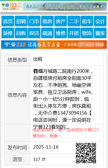 县城月城路二院南行200米,自建楼房月租房全阳面30平左右,干净明亮、地暖空调家具、独立卫浴厨房,wife、距一小一幼5分钟即到,临街出入停车方便,房东直租,无中介费13473094156 【电话咨询时,请一定说明在宁晋123看到的,谢谢!】 |