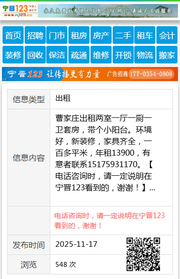 曹家庄出租两室一厅一厨一卫套房,带个小阳台。环境好,新装修,家具齐全,一百多平米,年租13900,有意者联系15175931170。 【电话咨询时,请一定说明在宁晋123看到的,谢谢!】 |