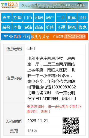 出租李史庄两层小楼一层两室一厅,二层三室两厅西临上城华府,南临大医院,北临一中三小走路5分路程,家电齐全,年租价格优惠随时可看房电话13930983662 【电话咨询时,请一定说明在宁晋123看到的,谢谢!】 |