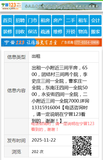 出租一小附近三间平房,6500,团结村三间两个院,李史庄三间一全院,曹家庄一全院,东南汪四间一全院5000,永安街四间一全院,二小附近三间一全院7000.详询13315916004 【电话咨询时,请一定说明在宁晋123看到的,谢谢!】 |