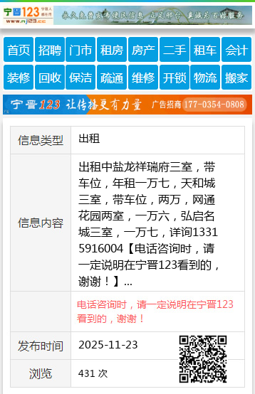 出租中盐龙祥瑞府三室,带车位,年租一万七,天和城三室,带车位,两万,网通花园两室,一万六,弘启名城三室,一万七,详询13315916004 【电话咨询时,请一定说明在宁晋123看到的,谢谢!】 |