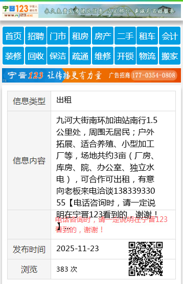 九河大街南环加油站南行1.5公里处,周围无居民;户外拓展、适合养殖、小型加工厂等,场地共约3亩(厂房、库房、院、办公室、独立水电),可合作可出租,有意向老板来电洽谈13833933055 【电话咨询时,请一定说明在宁晋123看到的,谢谢!】 |