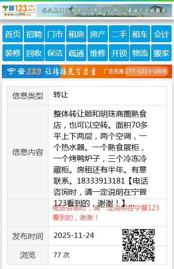整体转让颐和明珠商圈熟食店,也可以空转。面积70多平上下两层,两个空调,一个热水器。一个熟食展柜,一个烤鸭炉子,三个冷冻冷藏柜。房租还有半年。有意联系。18333913181 【电话咨询时,请一定说明在宁晋123看到的,谢谢!】 |