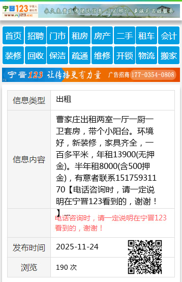 曹家庄出租两室一厅一厨一卫套房,带个小阳台。环境好,新装修,家具齐全,一百多平米,年租13900(无押金)。半年租8000(含500押金),有意者联系15175931170 【电话咨询时,请一定说明在宁晋123看到的,谢谢!】 |