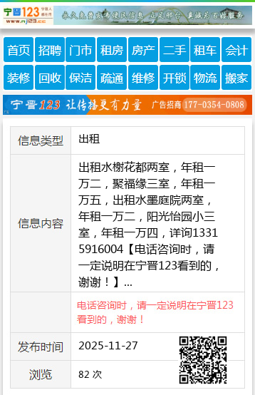 出租水榭花都两室,年租一万二,聚福缘三室,年租一万五,出租水墨庭院两室,年租一万二,阳光怡园小三室,年租一万四,详询13315916004 【电话咨询时,请一定说明在宁晋123看到的,谢谢!】 |