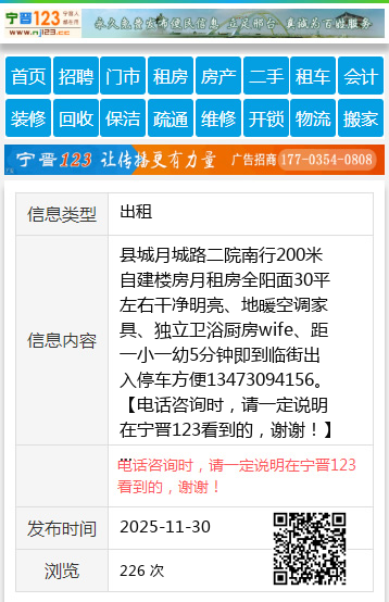 县城月城路二院南行200米自建楼房月租房全阳面30平左右干净明亮、地暖空调家具、独立卫浴厨房wife、距一小一幼5分钟即到临街出入停车方便13473094156。 【电话咨询时,请一定说明在宁晋123看到的,谢谢!】 |