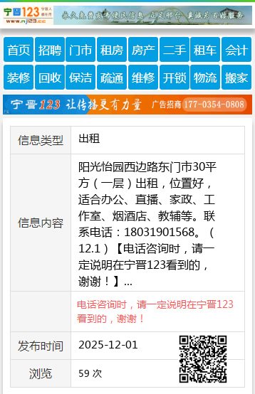 阳光怡园西边路东门市30平方(一层)出租,位置好,适合办公、直播、家政、工作室、烟酒店、教辅等。联系电话:18031901568。(12.1) 【电话咨询时,请一定说明在宁晋123看到的,谢谢!】 |