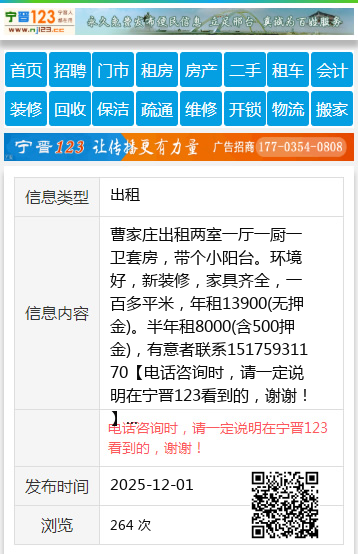 曹家庄出租两室一厅一厨一卫套房,带个小阳台。环境好,新装修,家具齐全,一百多平米,年租13900(无押金)。半年租8000(含500押金),有意者联系15175931170 【电话咨询时,请一定说明在宁晋123看到的,谢谢!】 |