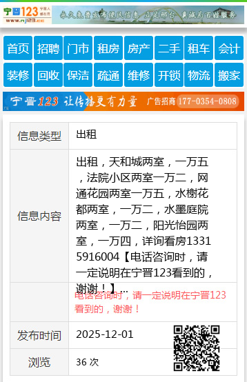 出租,天和城两室,一万五,法院小区两室一万二,网通花园两室一万五,水榭花都两室,一万二,水墨庭院两室,一万二,阳光怡园两室,一万四,详询看房13315916004 【电话咨询时,请一定说明在宁晋123看到的,谢谢!】 |