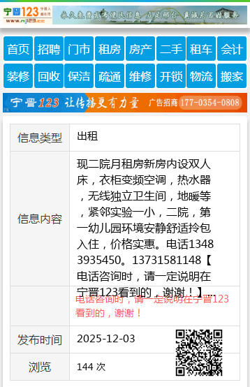 现二院月租房新房内设双人床,衣柜变频空调,热水器,无线独立卫生间,地暖等,紧邻实验一小,二院,第一幼儿园环境安静舒适拎包入住,价格实惠。电话13483935450。13731581148 【电话咨询时,请一定说明在宁晋123看到的,谢谢!】 |
