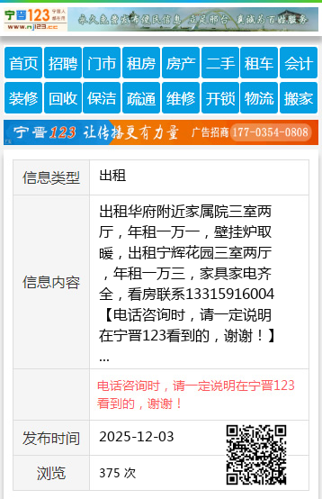 出租华府附近家属院三室两厅,年租一万一,壁挂炉取暖,出租宁辉花园三室两厅,年租一万三,家具家电齐全,看房联系13315916004 【电话咨询时,请一定说明在宁晋123看到的,谢谢!】 |