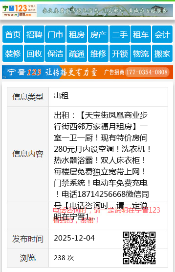 出租:【天宝街凤凰商业步行街西邻万家福月租房】一室一卫一厨!现有特价房间280元月内设空调!洗衣机!热水器浴霸!双人床衣柜!每楼层免费独立宽带上网!门禁系统!电动车免费充电!电话18714256668微信同号 【电话咨询时,请一定说明在宁晋123看到的,谢谢!】 |