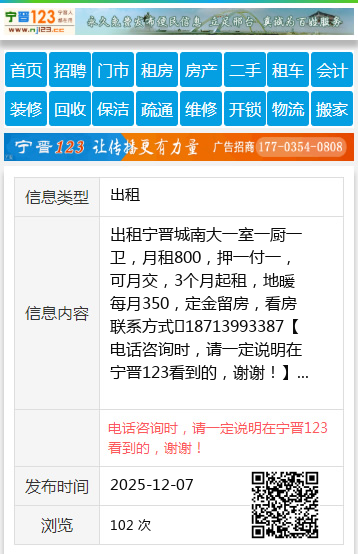 出租宁晋城南大一室一厨一卫,月租800,押一付一,可月交,3个月起租,地暖每月350,定金留房,看房联系方式☎18713993387 【电话咨询时,请一定说明在宁晋123看到的,谢谢!】 |