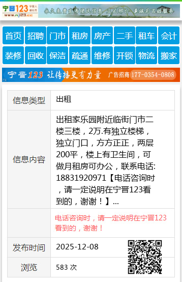 出租家乐园附近临街门市二楼三楼,2万.有独立楼梯,独立门口,方方正正,两层200平,楼上有卫生间,可做月租房可办公,联系电话:18831920971 【电话咨询时,请一定说明在宁晋123看到的,谢谢!】 |
