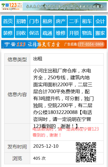 小河庄出租厂房仓库,水电齐全,250专线,建筑内地面实用面积2200平,二层三层合计700平免费使用,配有3吨提升机,可分割,独门独院,空院2200平,有二层办公楼18032220088 【电话咨询时,请一定说明在宁晋123看到的,谢谢!】 |