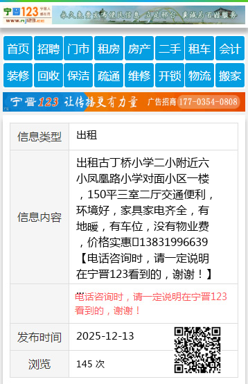 出租古丁桥小学二小附近六小凤凰路小学对面小区一楼,150平三室二厅交通便利,环境好,家具家电齐全,有地暖,有车位,没有物业费,价格实惠13831996639 【电话咨询时,请一定说明在宁晋123看到的,谢谢!】 |