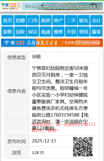 宁晋县妇幼院附近南50米路西贝贝月租房,一室一卫独立卫生间。整洁卫生月租年租均可优惠。相邻耀城一号小区实验一小学妇幼保健院童泰服装厂家具。空调热水器免费洗衣机无线停车方便临街公路17603194588 【电话咨询时,请一定说明在宁晋123看到的,谢谢!】 |