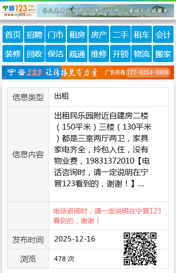 出租民乐园附近自建房二楼(150平米)三楼(130平米)都是三室两厅两卫,家具家电齐全,拎包入住,没有物业费,19831372010 【电话咨询时,请一定说明在宁晋123看到的,谢谢!】 |
