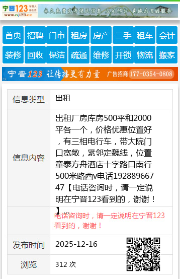 出租厂房库房500平和2000平各一个,价格优惠位置好,有三相电行车,带大院门口宽敞,紧邻定魏线,位置童泰方舟酒店十字路口南行500米路西v电话19288966747 【电话咨询时,请一定说明在宁晋123看到的,谢谢!】 |