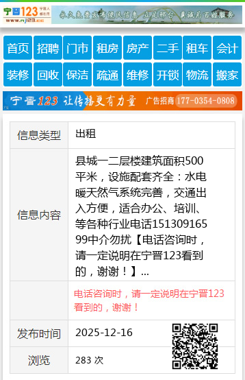 县城一二层楼建筑面积500平米,设施配套齐全:水电暖天然气系统完善,交通出入方便,适合办公、培训、等各种行业电话15130916599中介勿扰 【电话咨询时,请一定说明在宁晋123看到的,谢谢!】 |