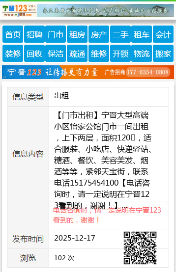 【门市出租】宁晋大型高端小区怡家公馆门市一间出租,上下两层,面积120㎡,适合服装、小吃店、快递驿站、糖酒、餐饮、美容美发、烟酒等等,紧邻天宝街,联系电话15175454100 【电话咨询时,请一定说明在宁晋123看到的,谢谢!】 |