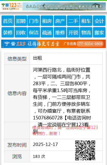 河渠西行路北,临街好位置,一层可隔成两间门市,共283平,二、三层各800平,每平米承重1.5吨可当库房,有货梯,一二三层都带双卫生间,门前方便停放多辆车,可办婚宴厅,有意者联系15076860728 【电话咨询时,请一定说明在宁晋123看到的,谢谢!】 |