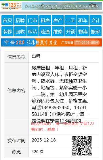 房屋出租,年租,月租,新房内设双人床,衣柜变频空调,热水器,无线独立卫生间,地暖等,紧邻实验一小,二院,第一幼儿园环境安静舒适拎包入住,价格实惠。电话13483935450。13731581148 【电话咨询时,请一定说明在宁晋123看到的,谢谢!】 |